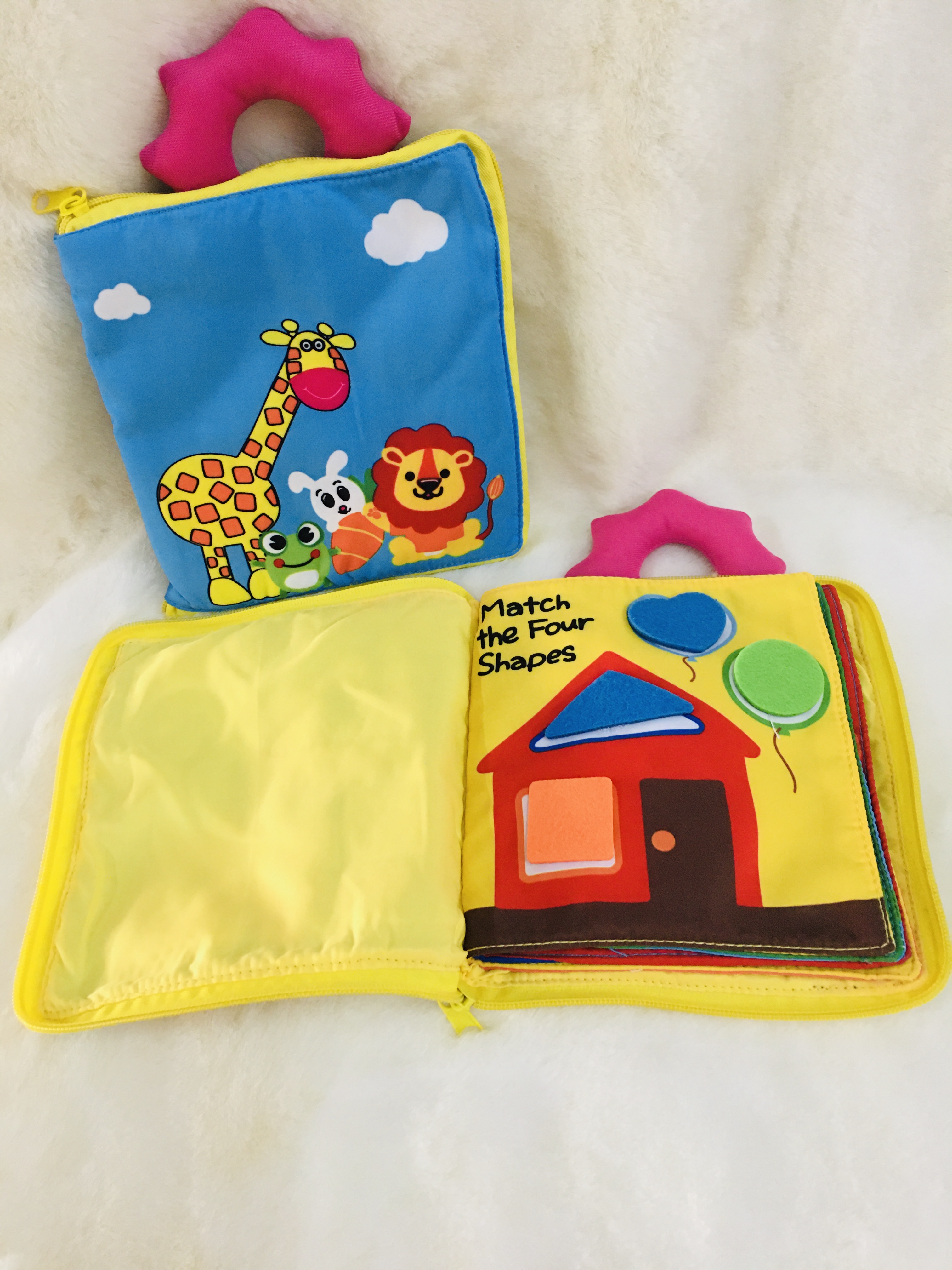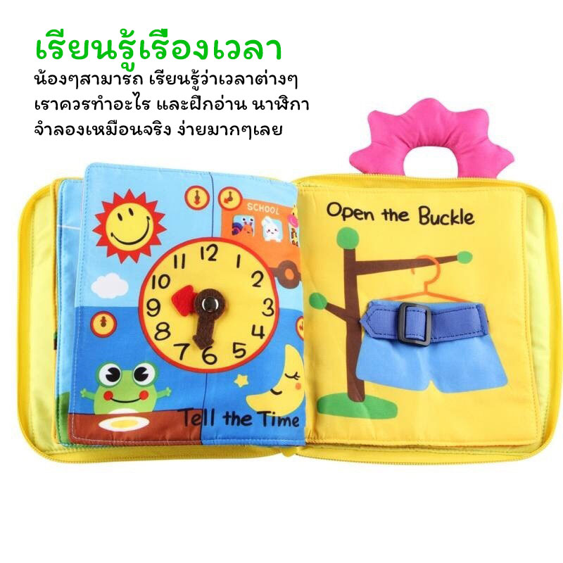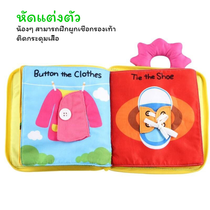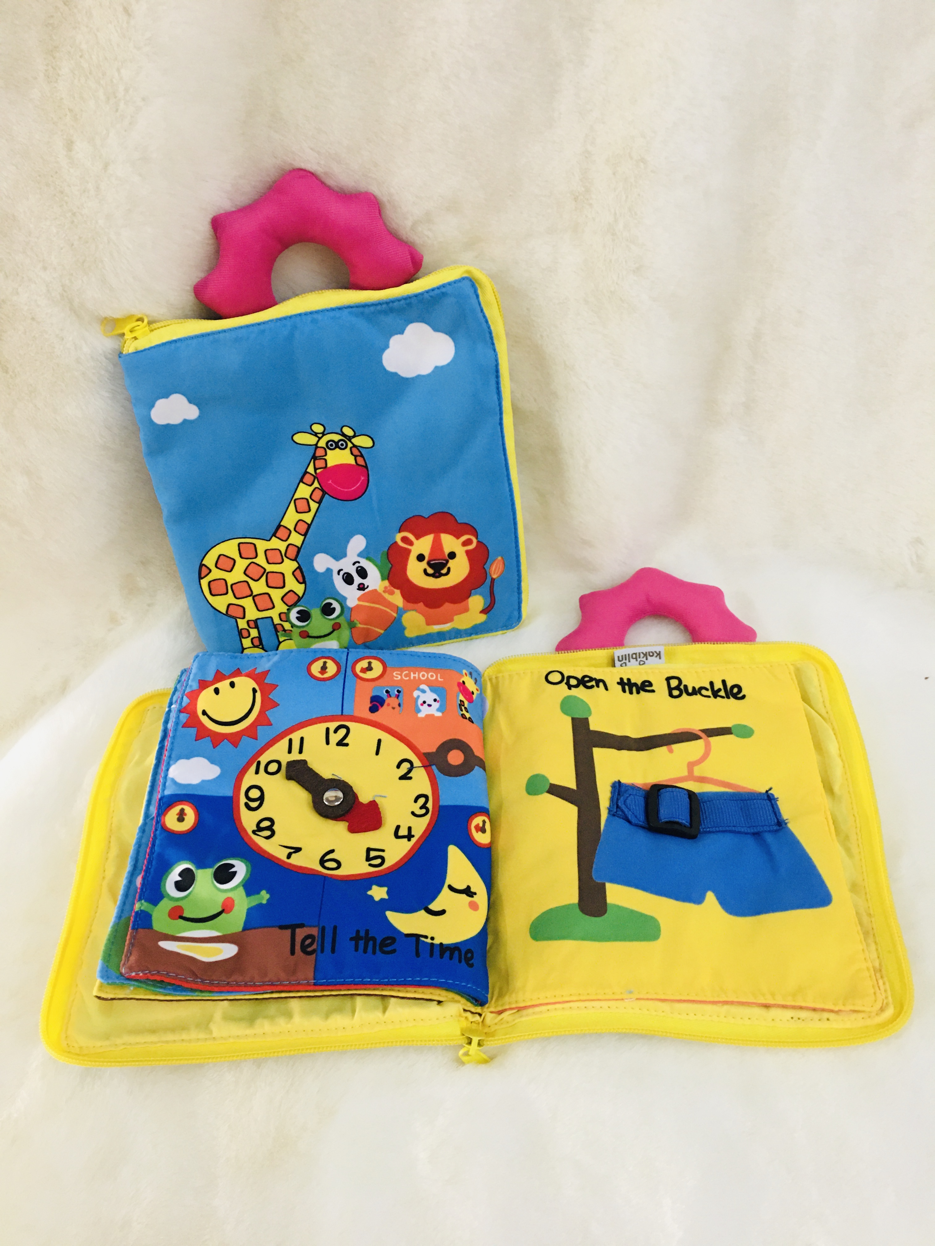 หนังสือผ้าแบบเสมือนจริง เย็บตัด มีตัวปะติด โดยมีพี่ยีราฟ สอนให้รู้จักทักษะพื้นฐานในชีวิตต่างๆ เช่น รู้จักรูปทรง การติดกระดุม ผูกเชือกรองเท้า อ่านเวลา ใช้ประกอบการเล่านิทาน เล่าเรื่องเพื่อฝึกให้น้องๆมีทักษะพื้นฐานในการดำรงชีวิต สามารถฝึก ผูก ปะ ติด ได้จริง ทำให้น้องๆสามารถฝึกได้จริงจากหนังสือเล่มเดียว ถือว่าคุ้มสุดๆไปเลยค่ะ